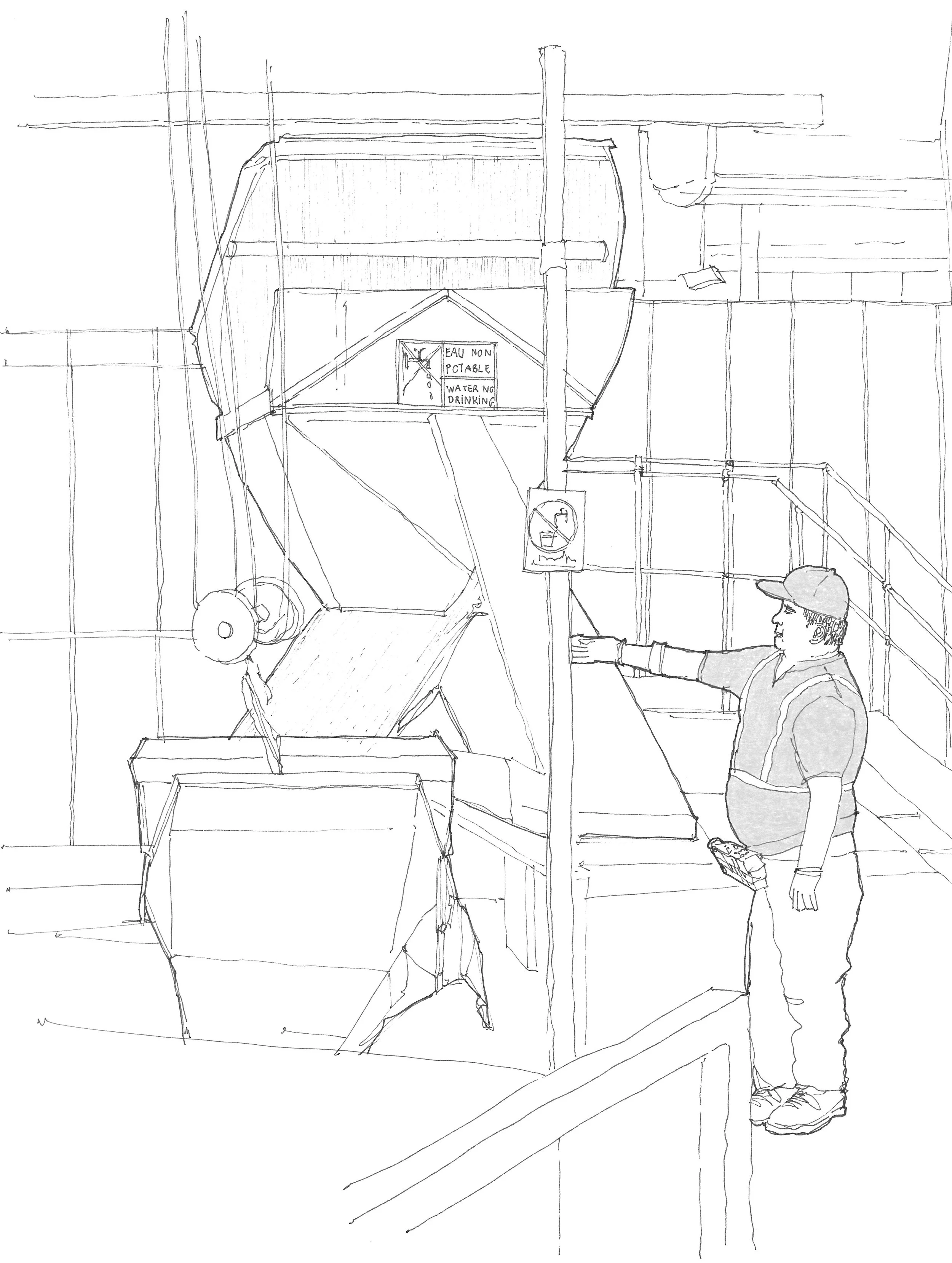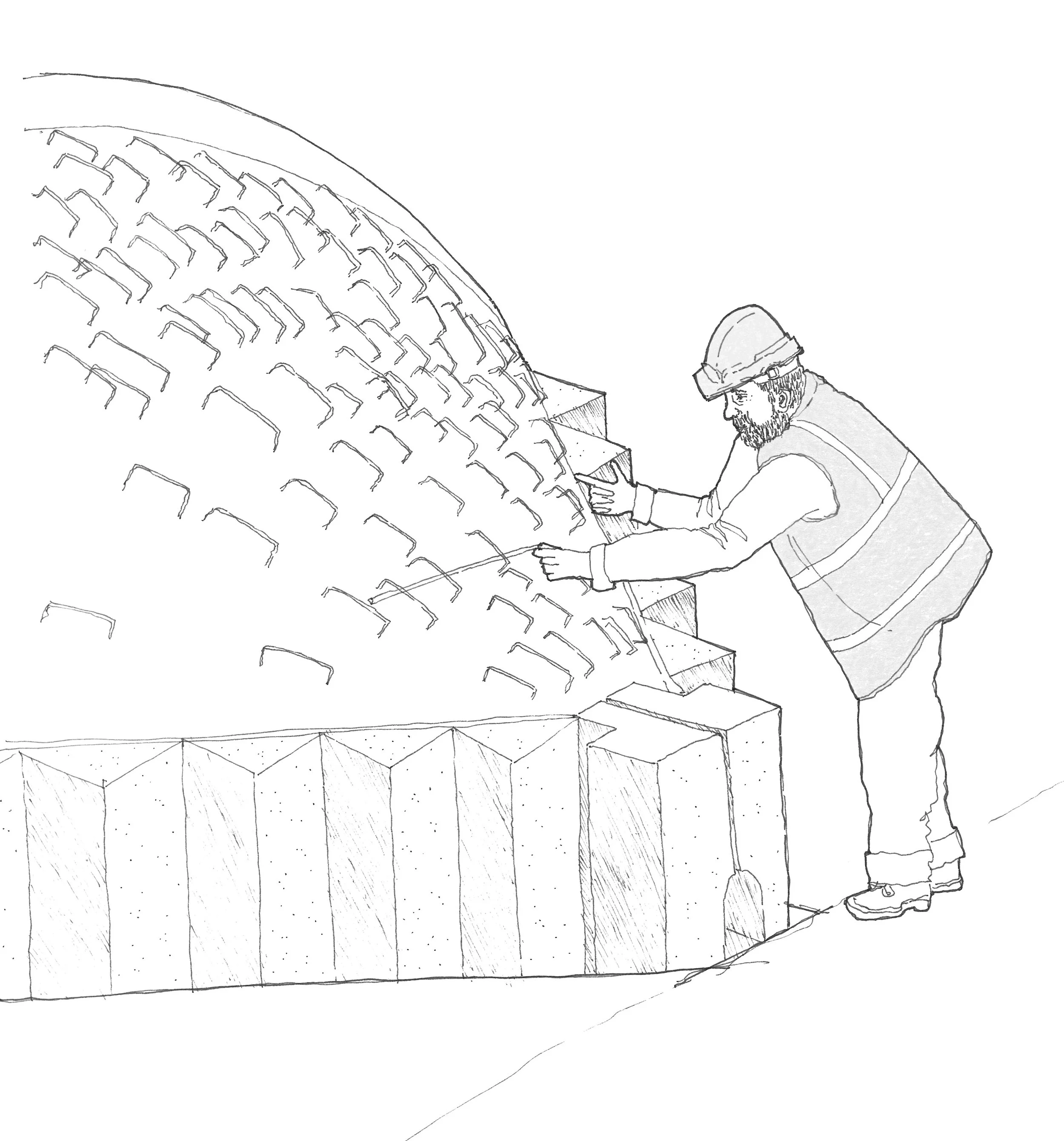 Le dessin devient ici un outil de lecture et de transmission. Il révèle la sensibilité constructive de l’architecture en rendant visibles les savoir-faire et les présences humaines qui participent à son élaboration. Corps à l’œuvre, détails constructifs et temporalités souvent invisibles, autant d’éléments qui composent un récit du chantier centré sur celles et ceux qui fabriquent l’architecture, mais qui en restent rarement les figures visibles.
