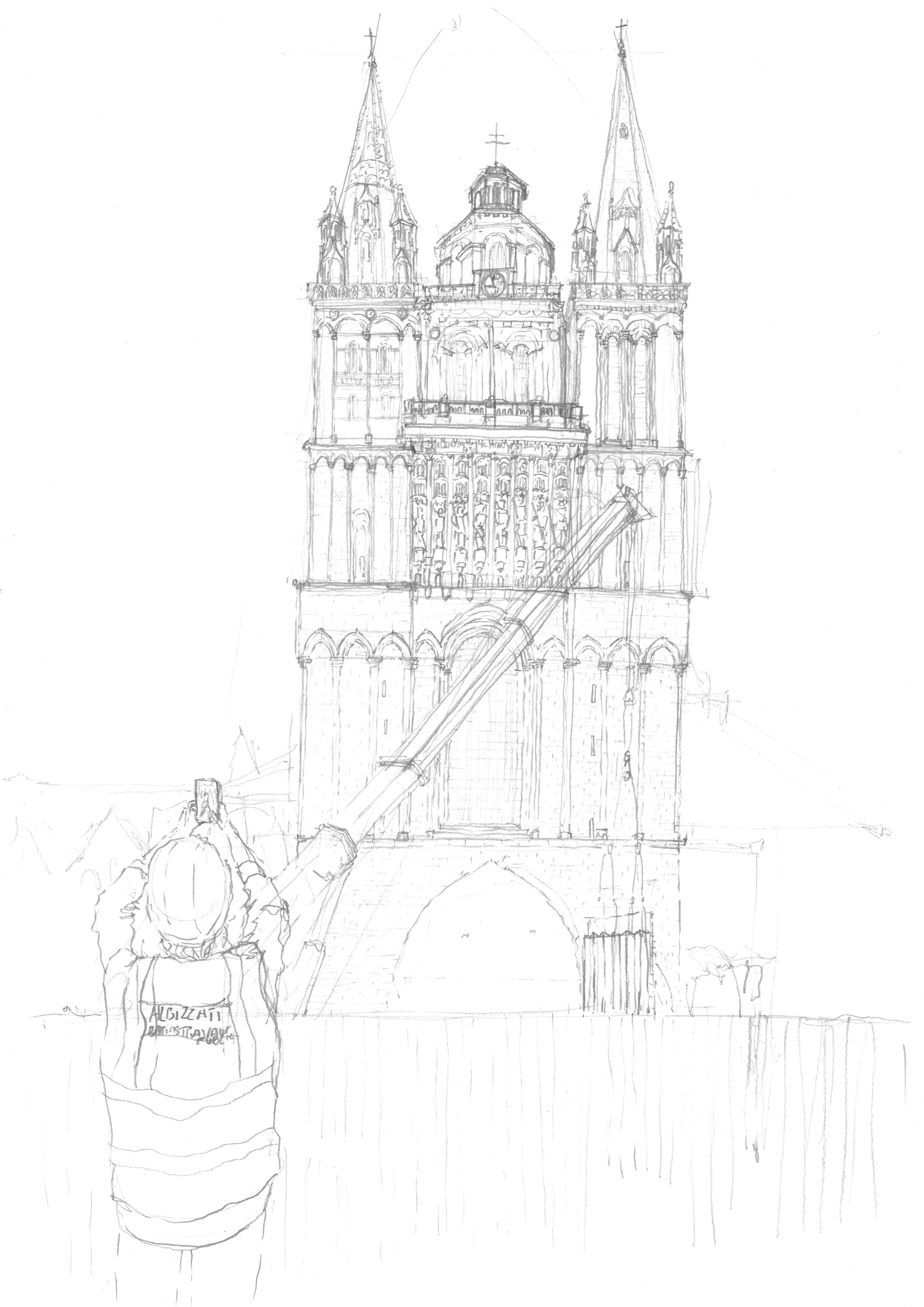 Le chantier de la galerie contemporaine de la Cathédrale Saint-Maurice d’Angers a été accompagné par le dessin, au fil de ses rythmes, de ses gestes et de ses transformations. Le projet s’inscrit avec retenue devant la façade principale, protégeant les sculptures polychromées du XIIe siècle des intempéries et du soleil, en développant une écriture précise, attentive à la présence du lieu et à son épaisseur historique.