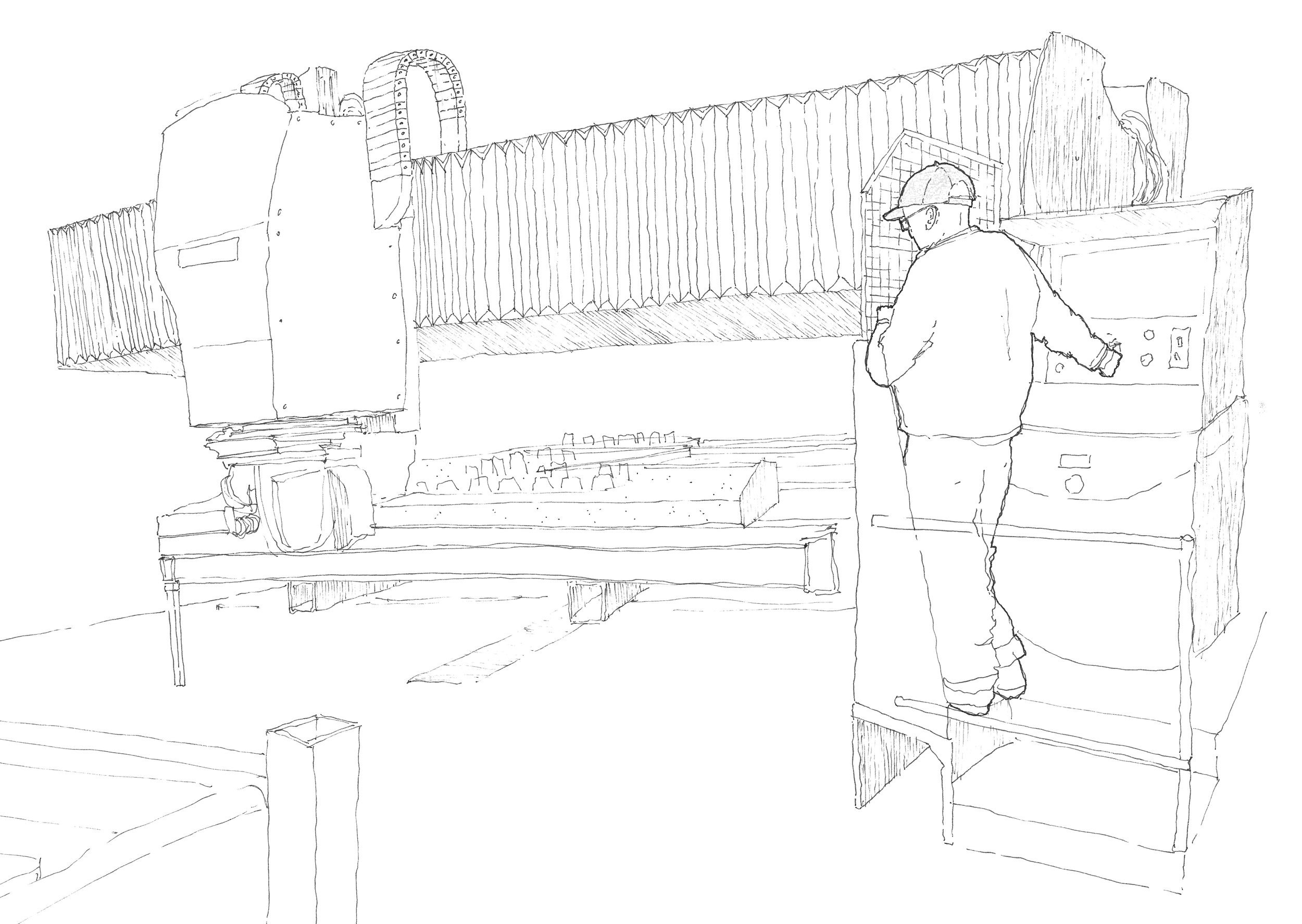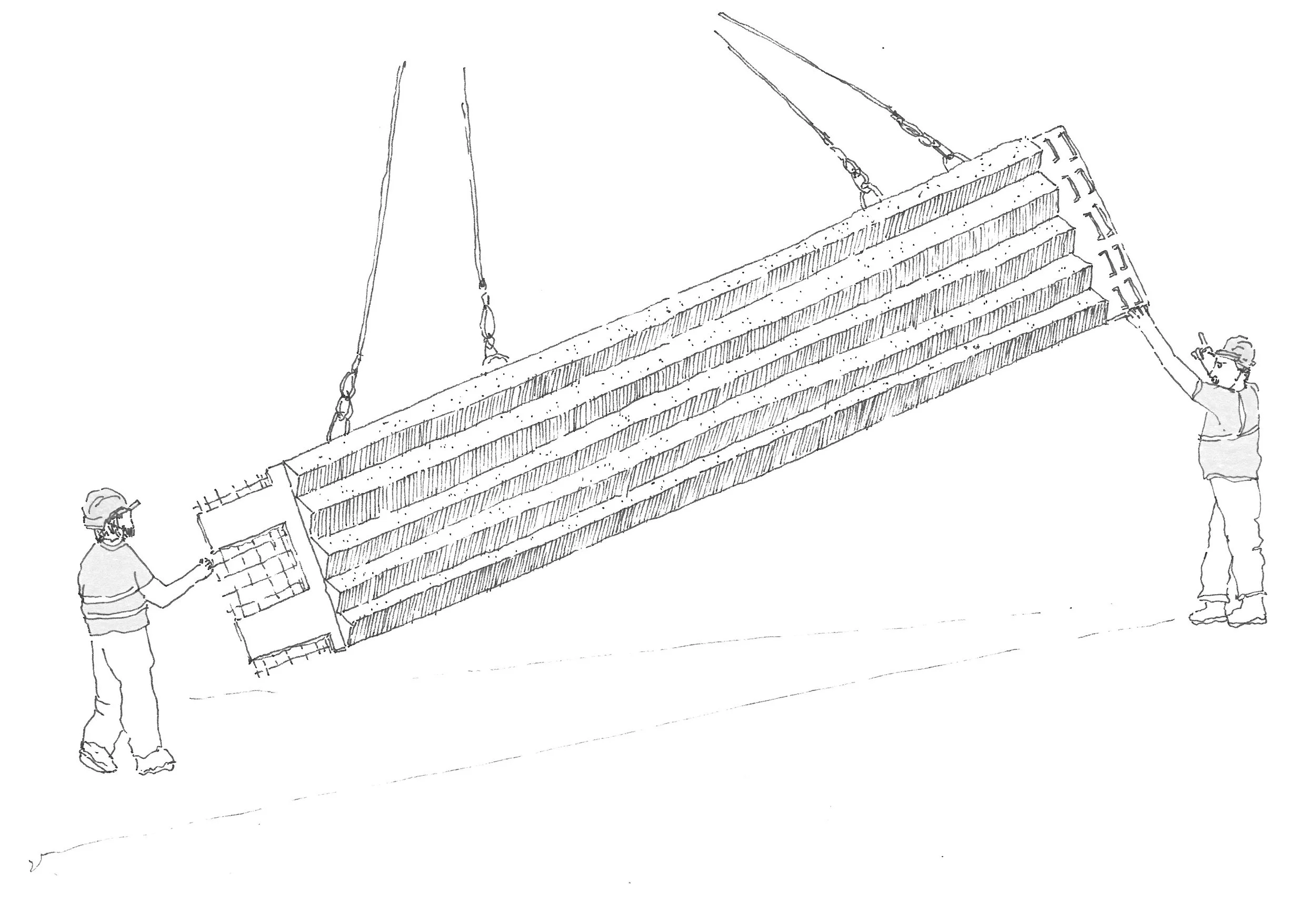 Déployé sur près d’un an, le suivi s’est construit à travers différentes phases du chantier, sur site comme en atelier de préfabrication, au plus près des processus de construction et de mise en œuvre. Une série de déplacements, de temps d’observation et de dessins réalisés sur le vif, au contact direct de la matière.